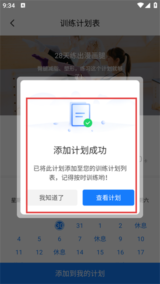 4、出现【添加计划成功】提示后,可选择【查看计划】确认训练安排,同时需按计划表的训练日按时完成训练。