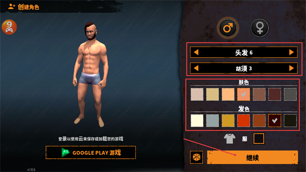1、在角色创建界面调整【头发】【胡须】【肤色】【发色】等外观选项后,点击【继续】按钮进入末日生存世界。