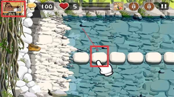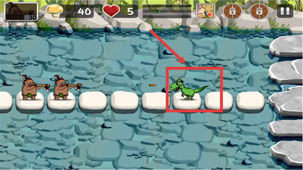2、在石板路径选位放置原始人,消耗【蘑菇】构建初始防线,阻挡恐龙靠近,为后续防御铺垫。