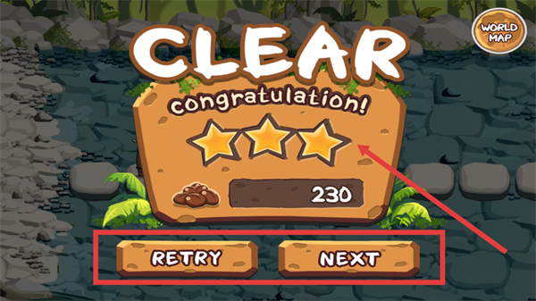 4、通关获三星奖励与资源,点【NEXT】进下一关,积累资源升级原始人,提升后续防御能力。