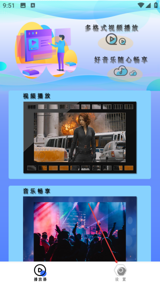1、进入播放器主页面,点击底部右侧的【设置】选项,进入设置功能页面。