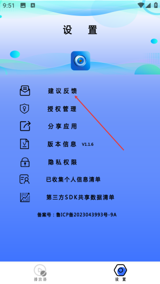 2、在设置页面,找到并点击【建议反馈】选项,进入问题反馈的操作页面。