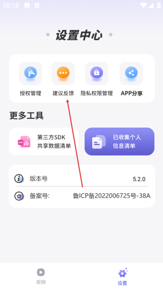 2、在设置中心页,找到并点击【建议反馈】选项,进入建议反馈填写页面。
