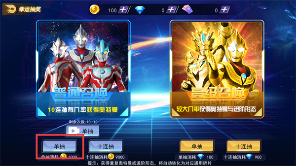 1、在【幸运抽奖】界面,点击【普通召唤-单抽】消耗金币获取强力奥特英雄后进入游戏对局。