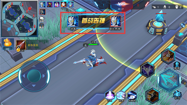 4、击败敌方单位后触发【首战告捷】提示,继续配合小兵推到敌方水晶即可获胜。