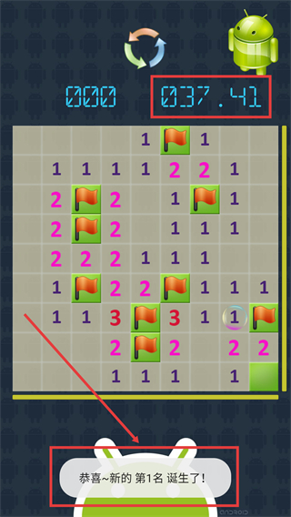 4、完成所有安全格子的展开与地雷标记后,即可通关游戏,同时会获得对应的排名提示(如“新的第1名诞生”)。