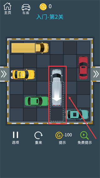 2、在关卡界面中,通过点击/拖动操作,移动阻碍车辆(如银色卡车)至指定区域,为目标车辆腾出通行空间。