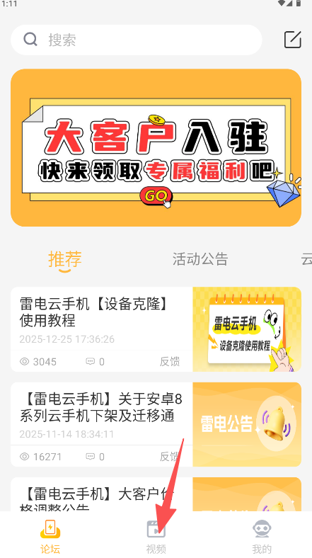 1、提供视频板块,专门聚合与云手机相关的教程、测评等视频内容。用户可浏览视频列表,点击封面进入观看与互动。