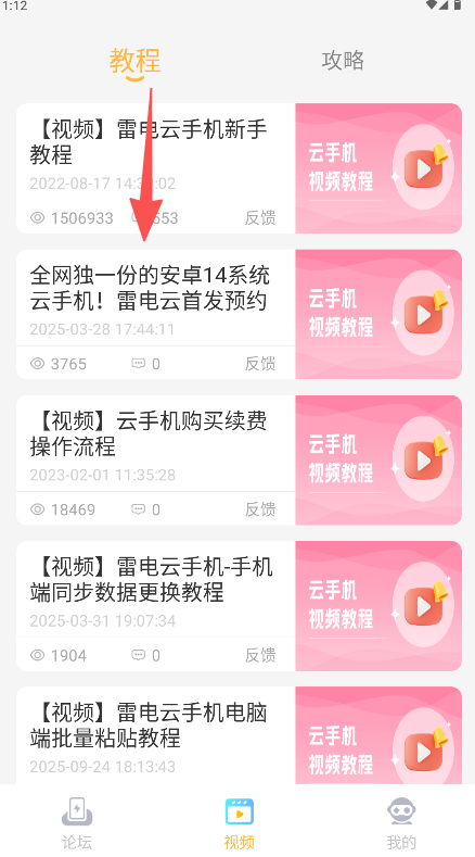 2、在视频列表中找到并点击右侧带有粉色“云手机视频教程”封面的目标教程。