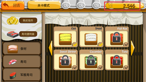 1、在关卡模式界面,使用钱币解锁食材,扩展可制作的寿司品类,丰富经营选项。
