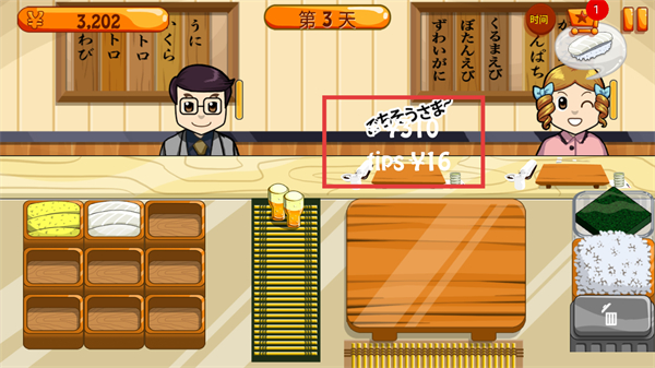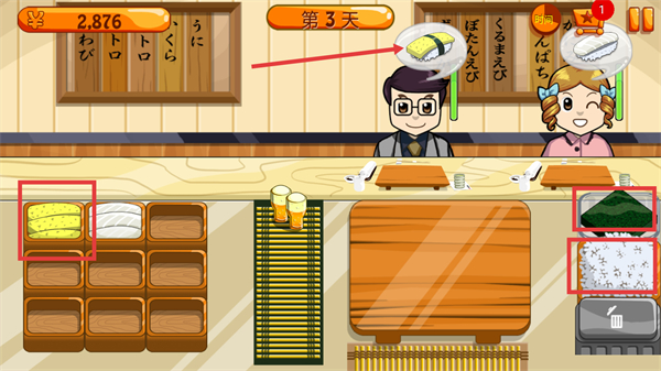2、在经营界面,按照方框所标注的食材作对应寿司,满足顾客订单提升营收。