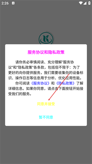 1、阅读【服务协议】与【隐私政策】后,点击【同意并接受】进入首页。