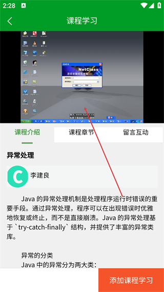 3、在课程列表中,选择目标课程(如【异常处理】)进入课程学习页面。