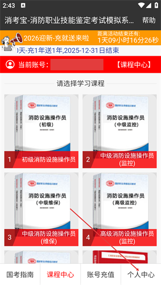 1、在课程中心页面,点击底部导航栏的【个人中心】选项。