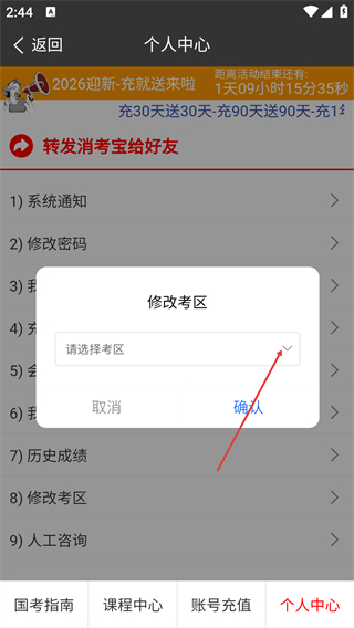 2、在个人中心界面,选择【修改考区】选项,弹出修改考区的操作窗口。