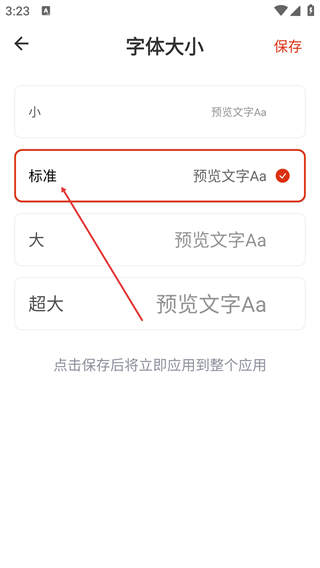 4、在字体大小界面,选择目标大小(如【标准】),点击【保存】应用设置。