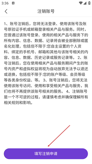 4、阅读注销规则后,点击【填写注销申请】按钮提交账号注销请求。