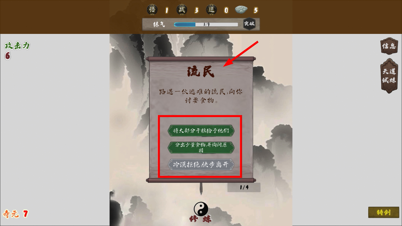 1、遇到流民讨食物时,建议选择【分出少量食物-并询问原因】,既不浪费资源,又能触发后续可能的奇遇线索。