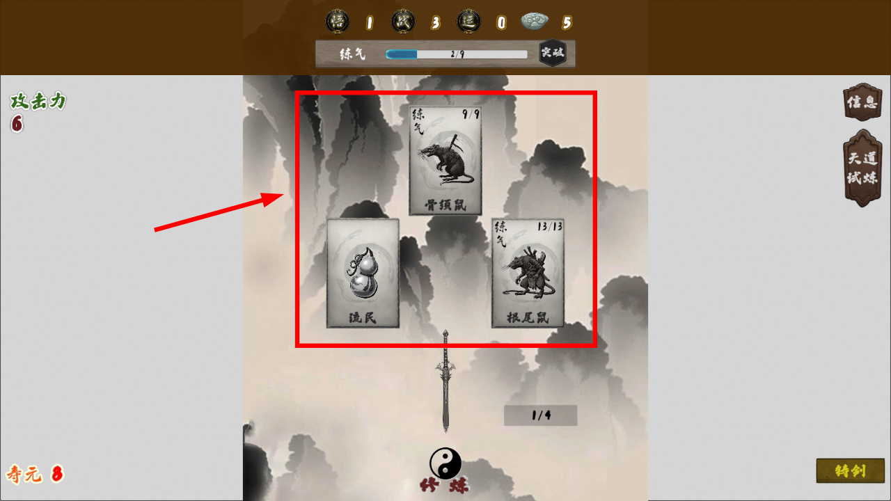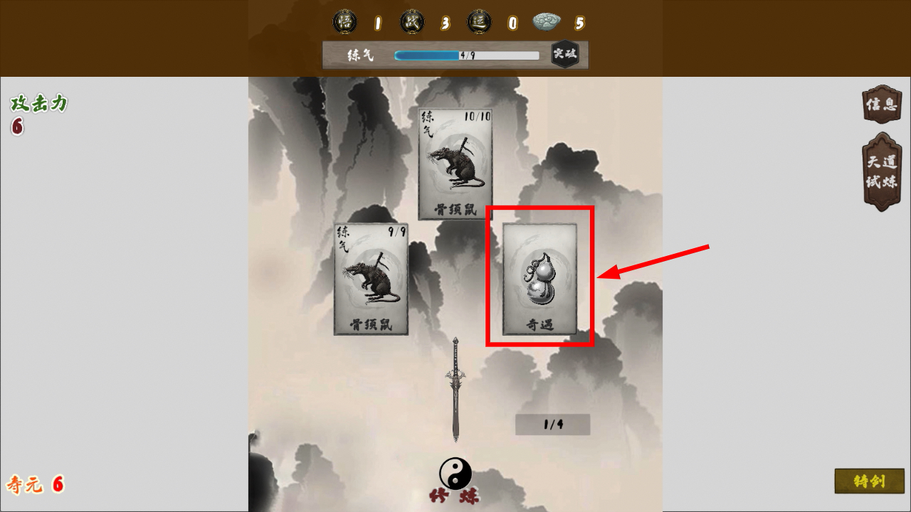 2、战斗中遇到【骨须鼠】时,优先击败怪物,同时留意界面中的【奇遇】卡片,点击后可触发特殊机缘事件。