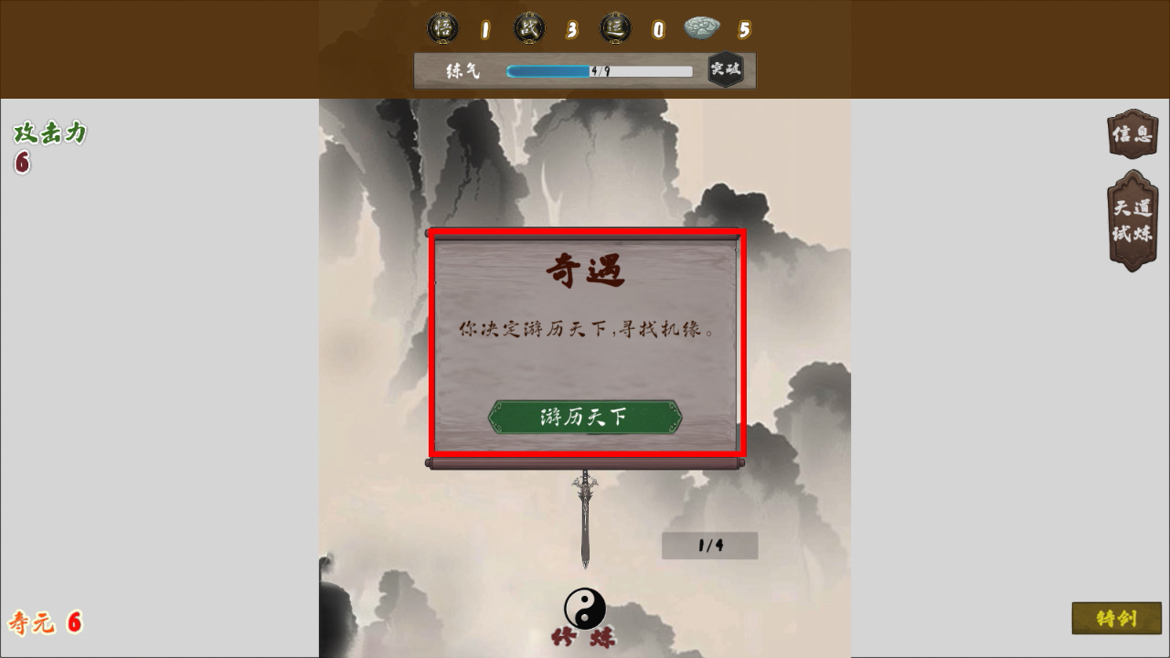 3、在奇遇界面中,点击【游历天下】按钮,开启自由探索,寻找机缘,这是获取稀有资源和剧情线索的关键方式。