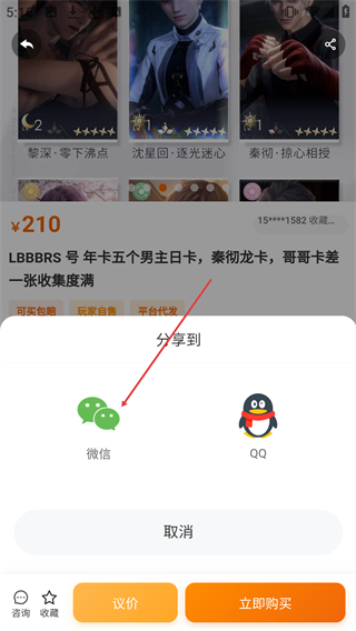 4、在该分享窗口点击【微信】可将该账号信息分享至微信。