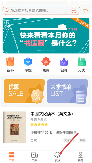 1、进入书城页面,点击底部的【发现】按钮,进入相关内容浏览界面。