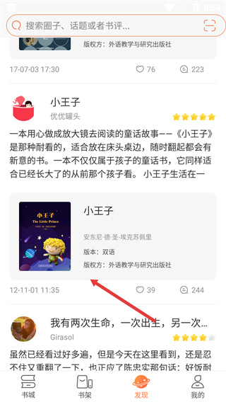 2、在【发现】页面中,找到【小王子】的书评内容,点击对应的书籍区域,进入该书的详情互动界面。