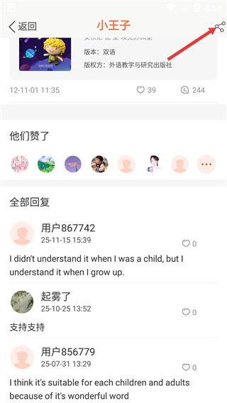 3、进入【小王子】的详情界面,可查看“他们赞了”及回复内容,点击右上角的分享图标,准备选择分享平台。