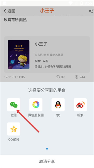 4、在分享平台选择界面,选定【微信】等目标平台,即可将【小王子】的相关内容分享至对应渠道。