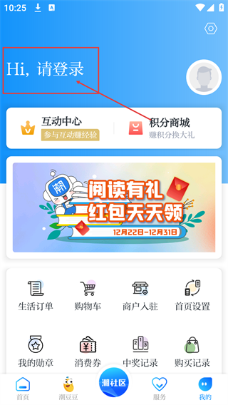 2、在个人页面点击【Hi,请登录】区域,跳转至登录选择页面。