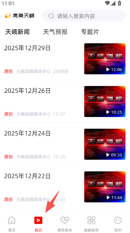 1、提供板块切换功能,点击视讯进入对应页面,选择天峨新闻或专题片板块,浏览对应类别的本地内容。