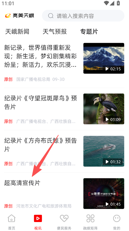 2、在视讯页面选择专题片板块、浏览对应内容。
