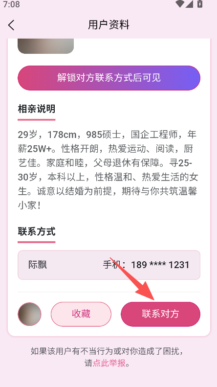 3、配备收藏联系对方等功能,覆盖从信息浏览到互动的全流程,适配相亲交友的互动场景。