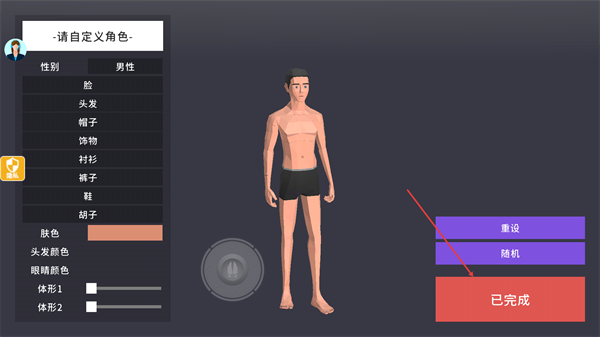2、进入角色自定义界面,可设置性别、外观等元素,完成自定义后点击“已完成”按钮。
