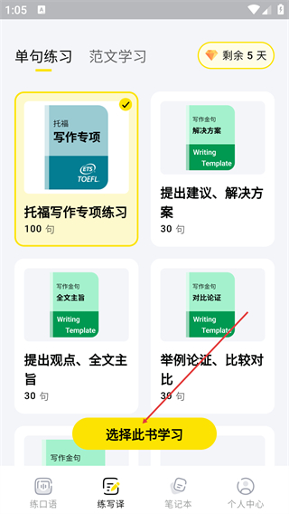 2、在写译页面选定学习内容后,点击【选择此书学习】进入对应练习模块。