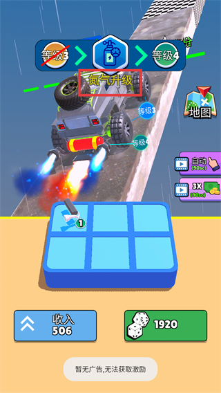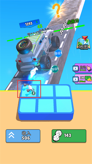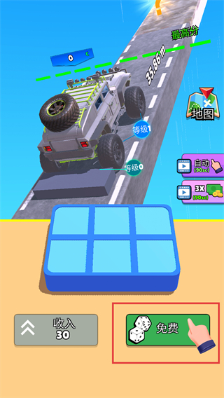 1、点击按钮获取材料,投掷后推进赛车前进,开启爬坡进程。