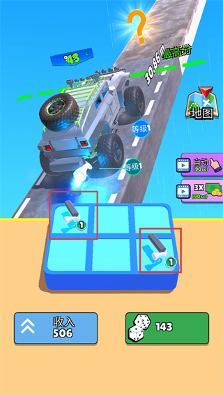 3、合并后的道具可以装入车辆,强化道具效果,助力赛车在爬坡中保持优势。