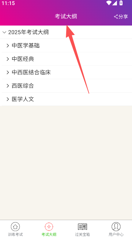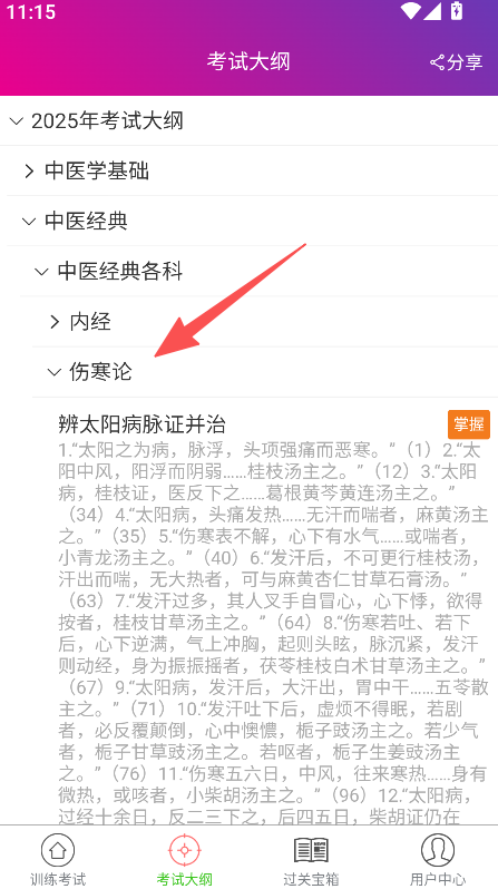 1、设考试大纲板块,含2025年考试大纲下的中医学基础、中医经典等分类,展示大纲内容,适配考试大纲的学习需求。