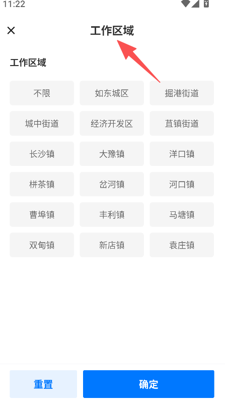 1、提供工作区域选择功能,进入工作区域页面,选择如东城区等目标区域,确定本地求职的岗位范围。