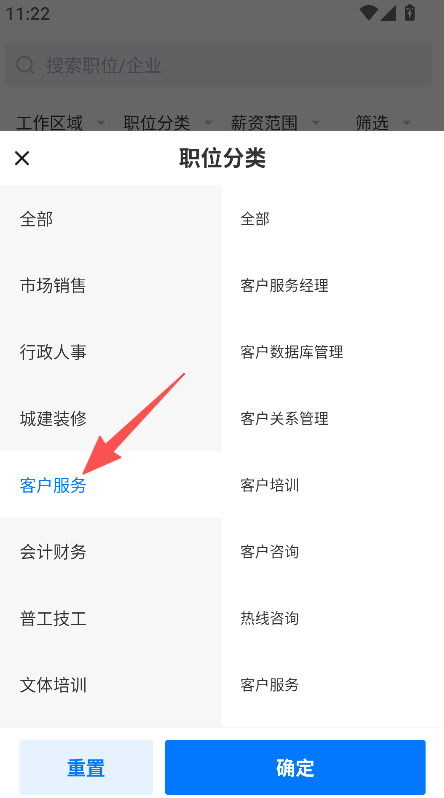 2、支持职位分类筛选功能,进入职位分类页面,选择客户服务等对应类别,缩小岗位的查找范围。