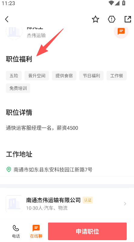 3、具备职位申请功能,进入职位详情页面,查看信息后点击申请职位,完成如东本地的求职操作。