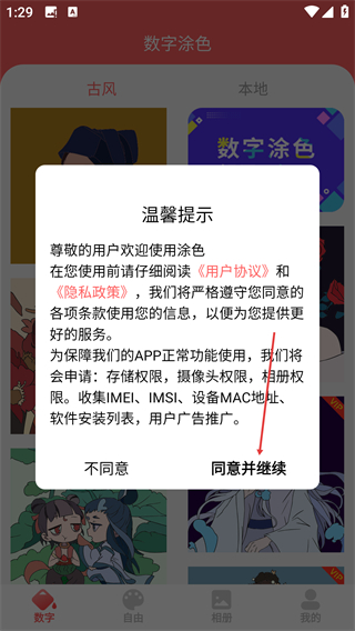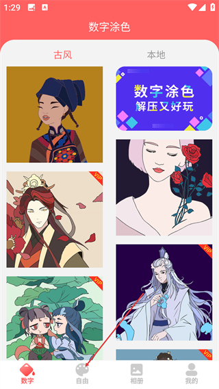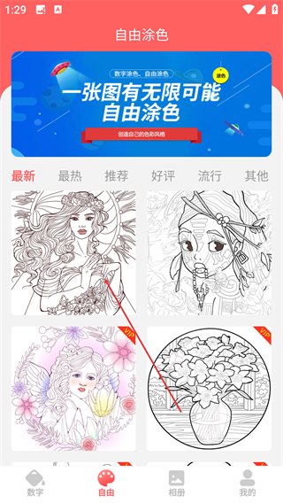 2、在主界面点击底部【自由】,可进入自由涂色的内容选择页面。