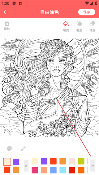 4、在涂色界面选择颜色,通过工具进行涂色操作,完成后可点击【保存】。