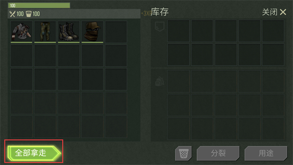 3、打开库存界面后,点击【全部拿走】按钮,将箱内的服装类道具收入背包,提升角色生存装备。