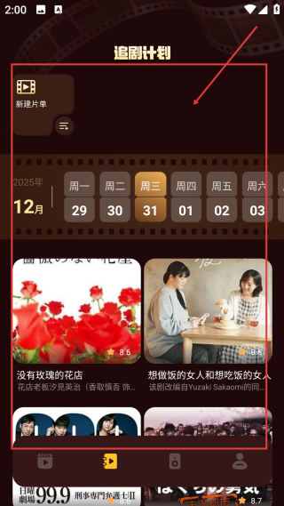 2、在追剧计划页面,新建片单后【选择日期,查看对应日期的影视推荐内容】。