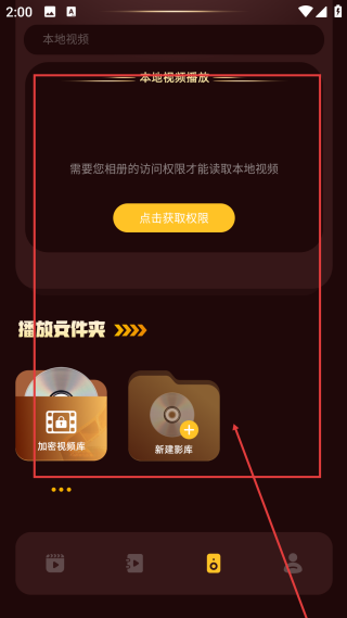 3、进入本地视频页面,【获取权限】后,可【使用加密视频库】等播放文件夹功能。