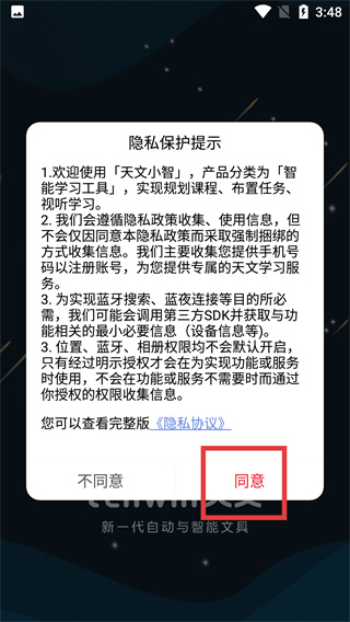 1、阅读【隐私保护提示】中的信息收集规则,查看完整【隐私协议】后,点击【同意】按钮,即可进入“天小文智”软件主界面。