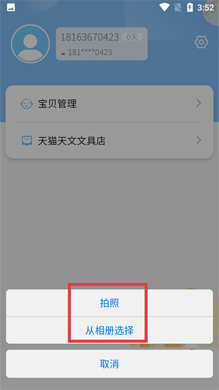 4、点击【我的】页面的头像区域后,会弹出操作选项,可选择【拍照】或【从相册选择】的方式,来设置头像内容。