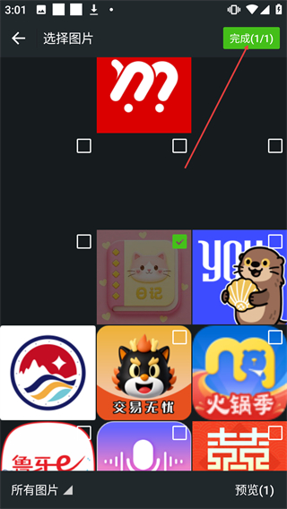 4、在相册页面选定目标图片后,点击右上角的【完成(1/1)】按钮,即可完成照片上传的选择操作。