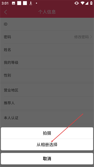 3、在弹窗中选择【从相册选择】,可进入相册图片选择页面。